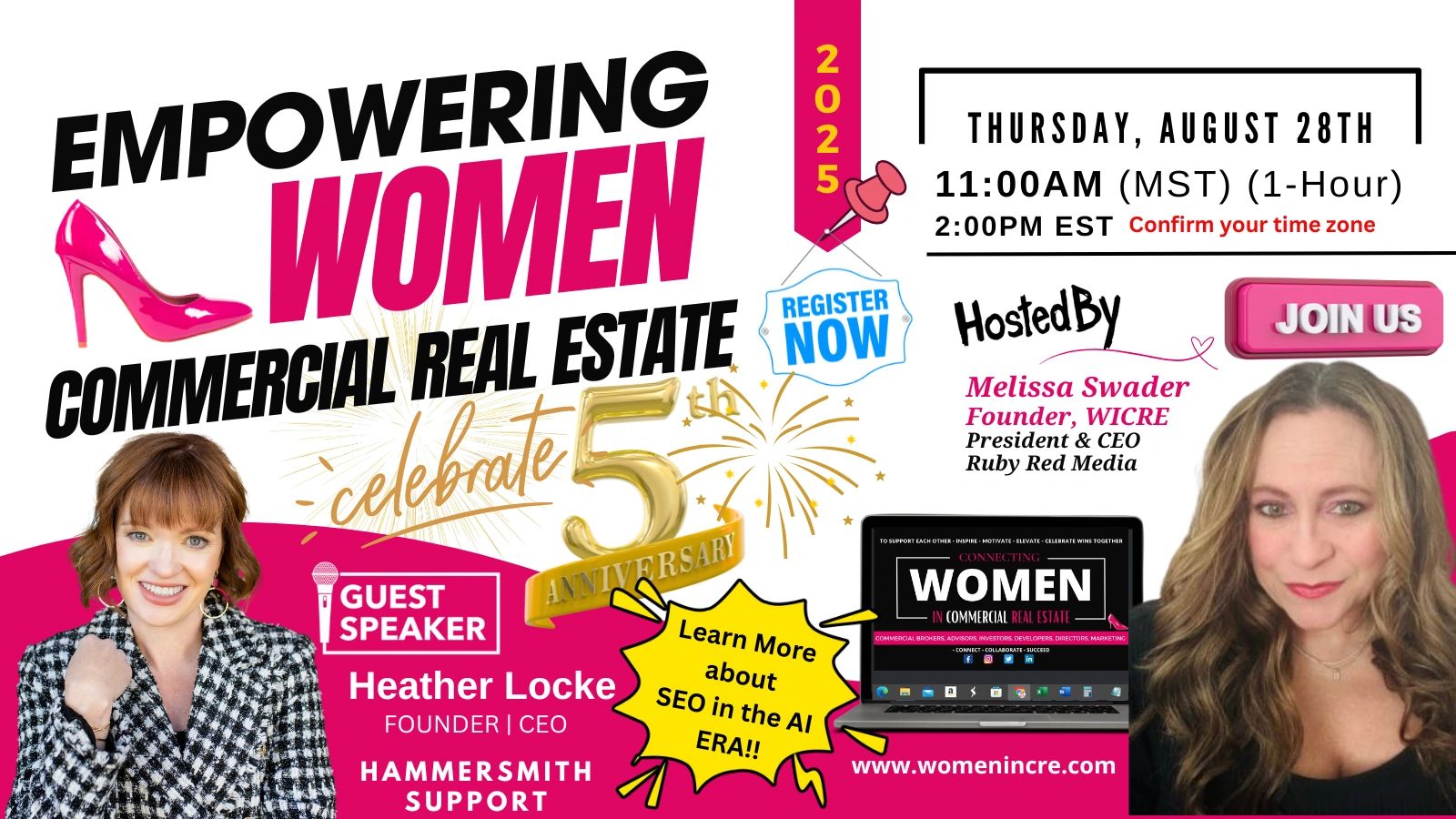It is time to THRIVE in 2025! Join us on Thursday, August 28th to welcome our guest speaker, Heather Locke with Hammersmith Support. Join more #womenincre from across the country to discuss all things CRE.